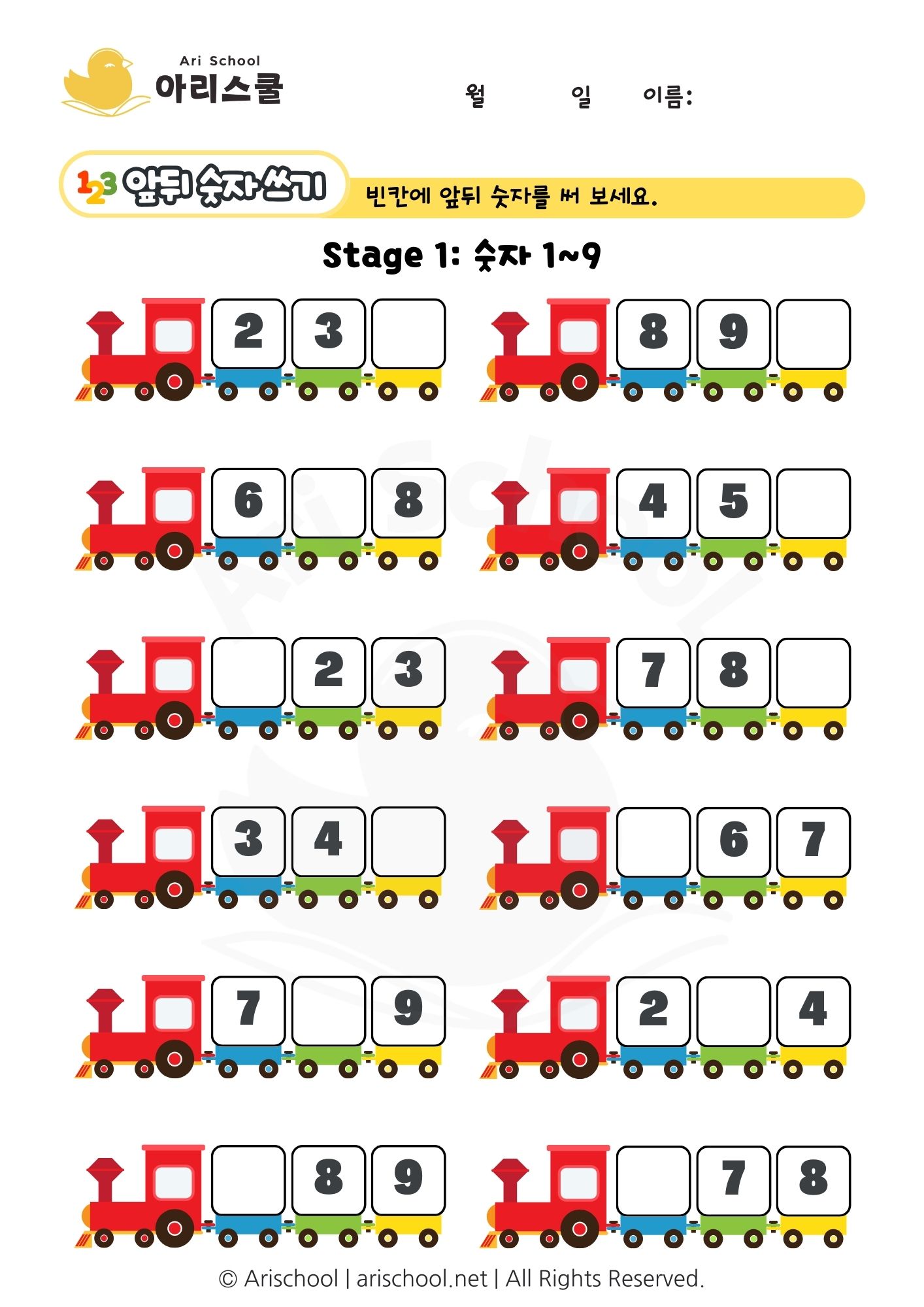 이 워크시트는 숫자를 보고 빈칸에 들어갈 알맞은 숫자를 추론하여 채우는 학습지입니다.
