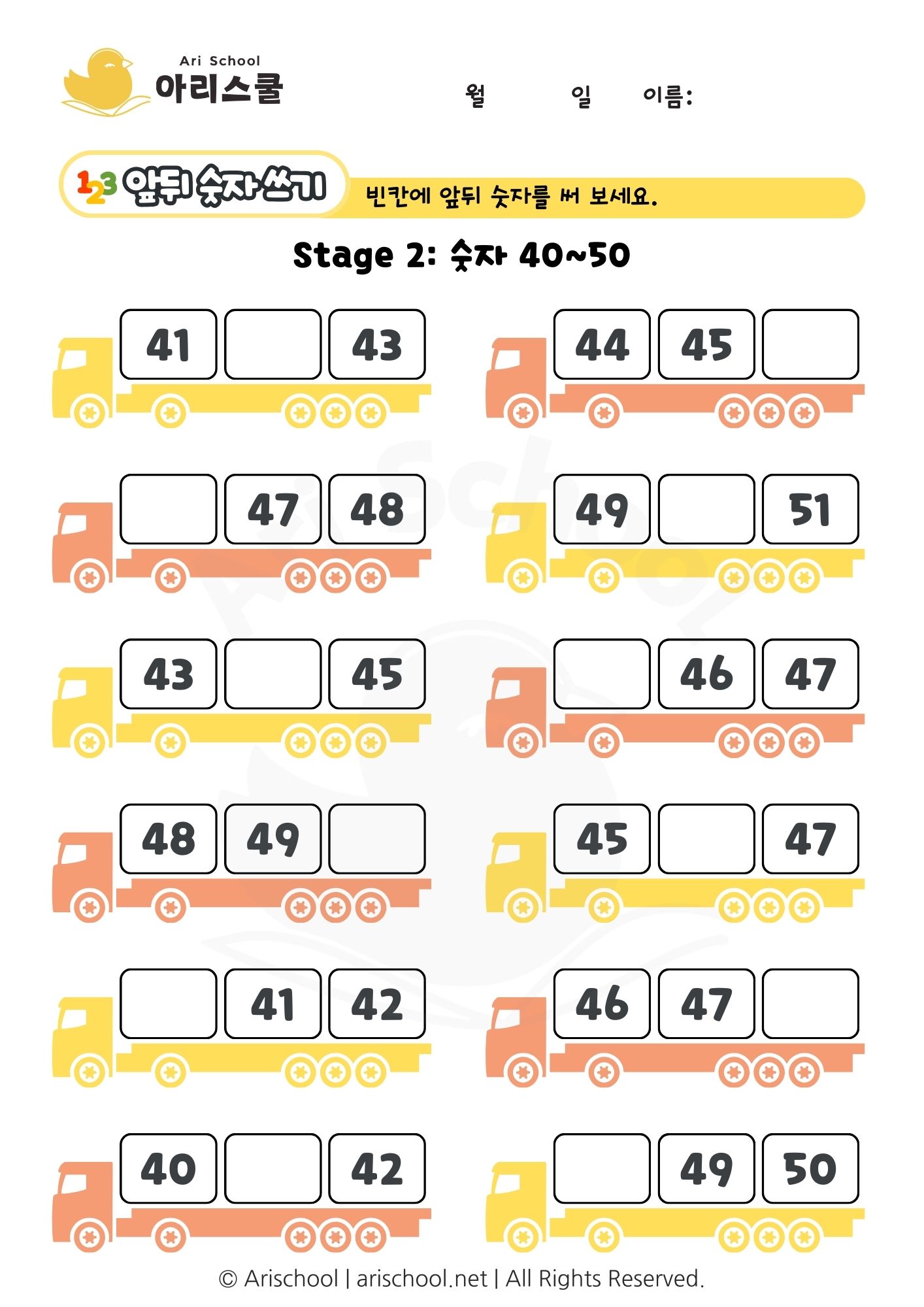 이 워크시트는 숫자를 보고 빈칸에 들어갈 알맞은 숫자를 추론하여 채우는 학습지입니다.