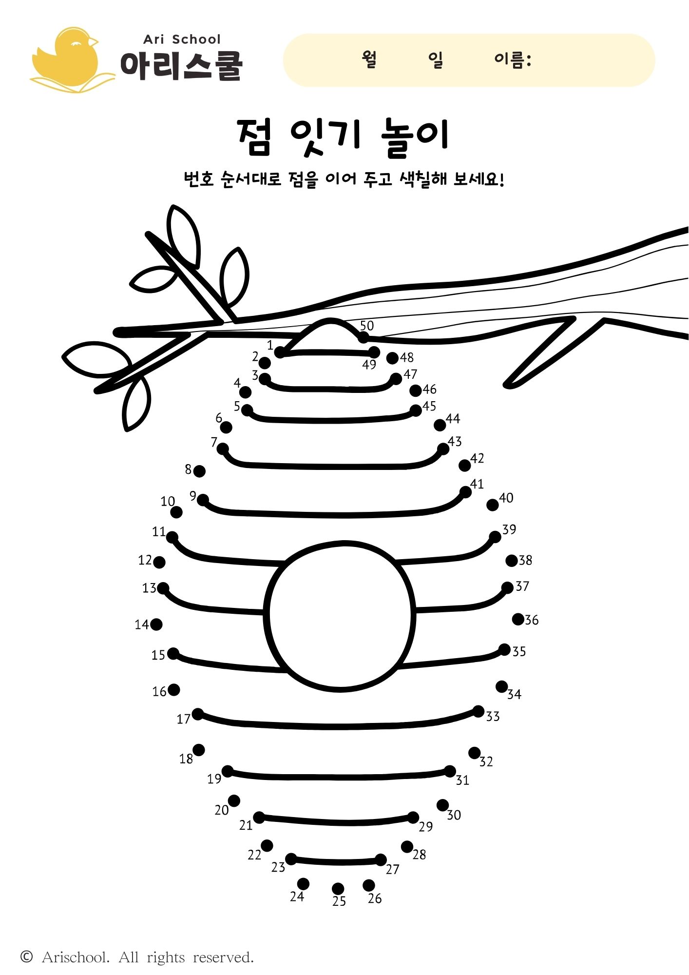 순서대로 점을 이어서 완성하는 점 잇기 학습지입니다. 선을 다 이은 후에는 알록달록 예쁘게 색칠해 주세요. 숫자 순서를 익히고, 집중력을 키울 수 있습니다.