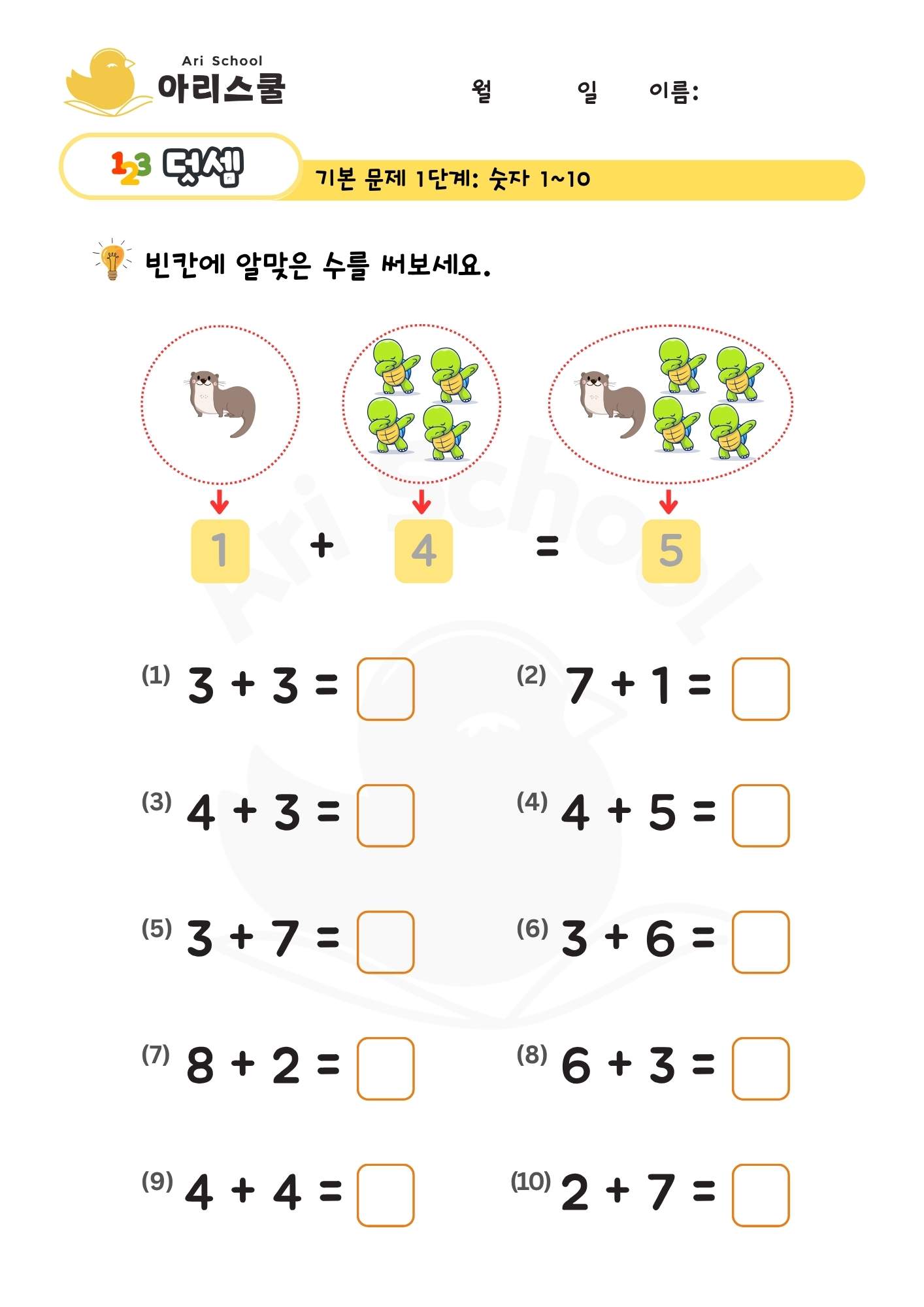 이 학습지는 1부터 10까지의 수를 더하는 기초 덧셈 연습지입니다. 아이들이 숫자의 개념을 자연스럽게 익히고, 수 감각과 기초 연산 능력을 기르도록 도와줍니다.