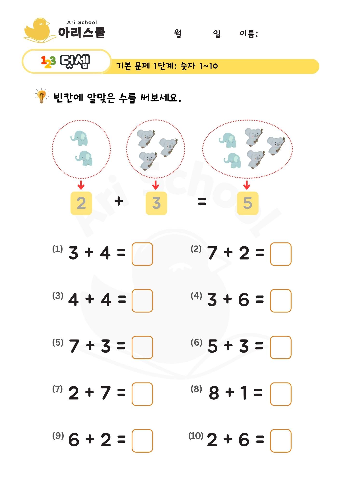 이 학습지는 1부터 10까지의 수를 더하는 기초 덧셈 연습지입니다. 아이들이 숫자의 개념을 자연스럽게 익히고, 수 감각과 기초 연산 능력을 기르도록 도와줍니다.