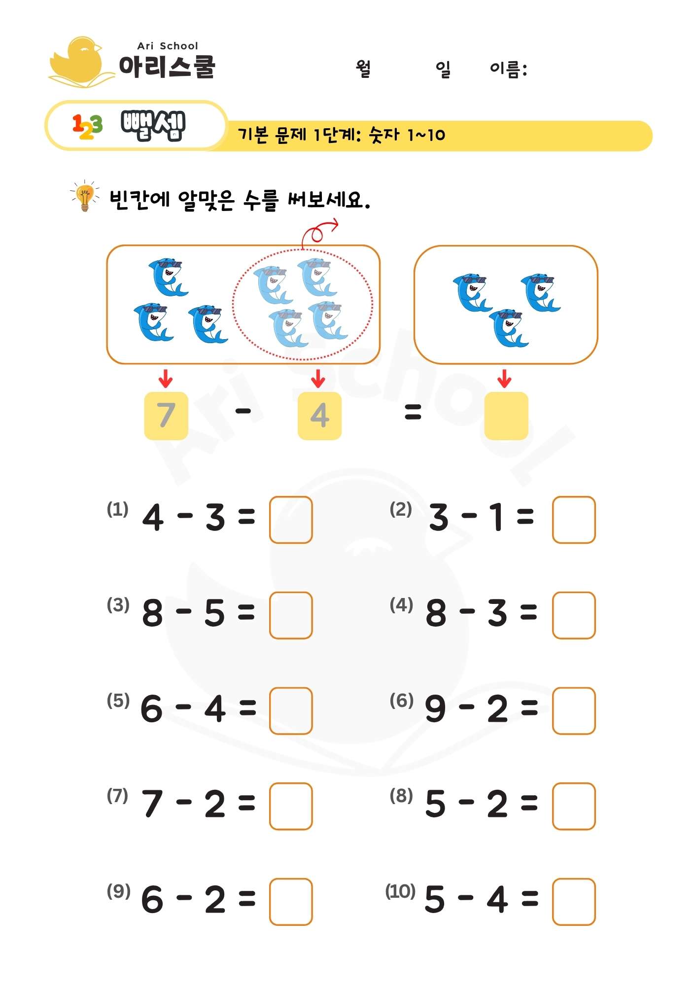 뺄셈은 ‘전체 수에서 일부를 빼서 남은 수를 구하는 연산’으로, 수의 크기와 차이를 자연스럽게 이해할 수 있도록 도와줍니다.