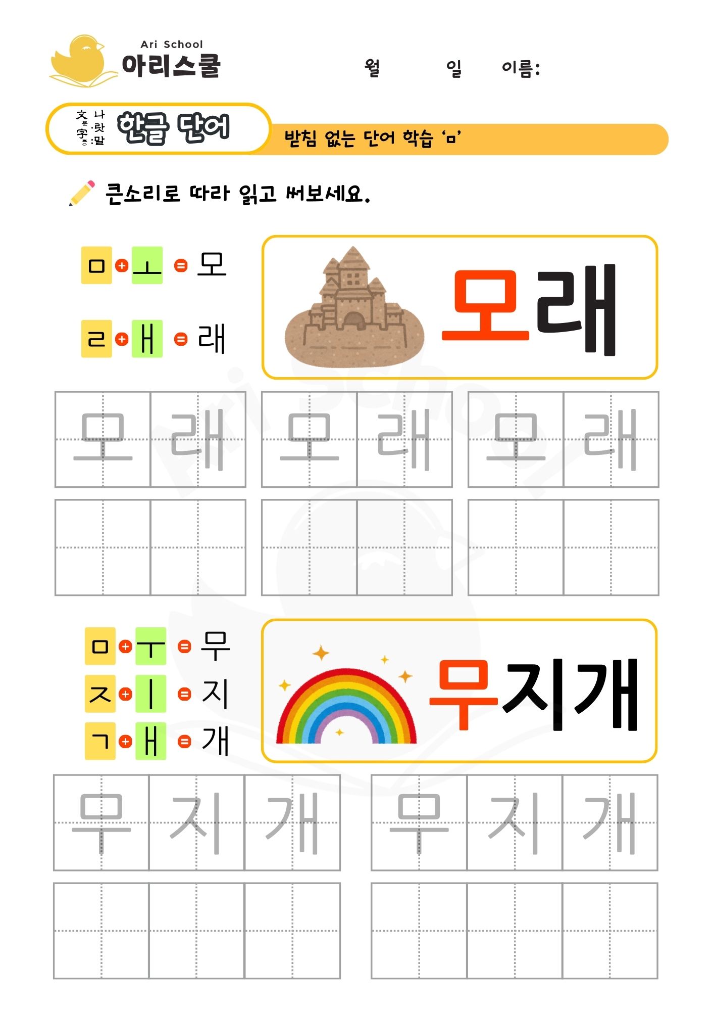 받침이 없는 단어를 연습하는 학습지입니다. 자음과 모음의 조합을 보며 어떤 소리가 나는지 읽고, 순서대로 정확하게 쓸 수 있도록 지도해주세요.
