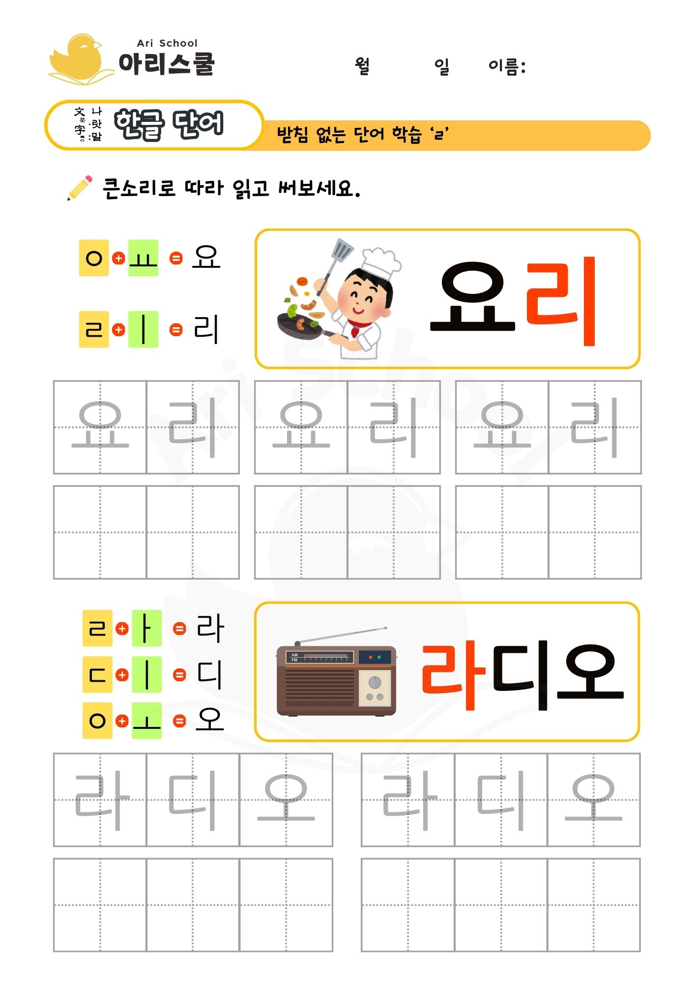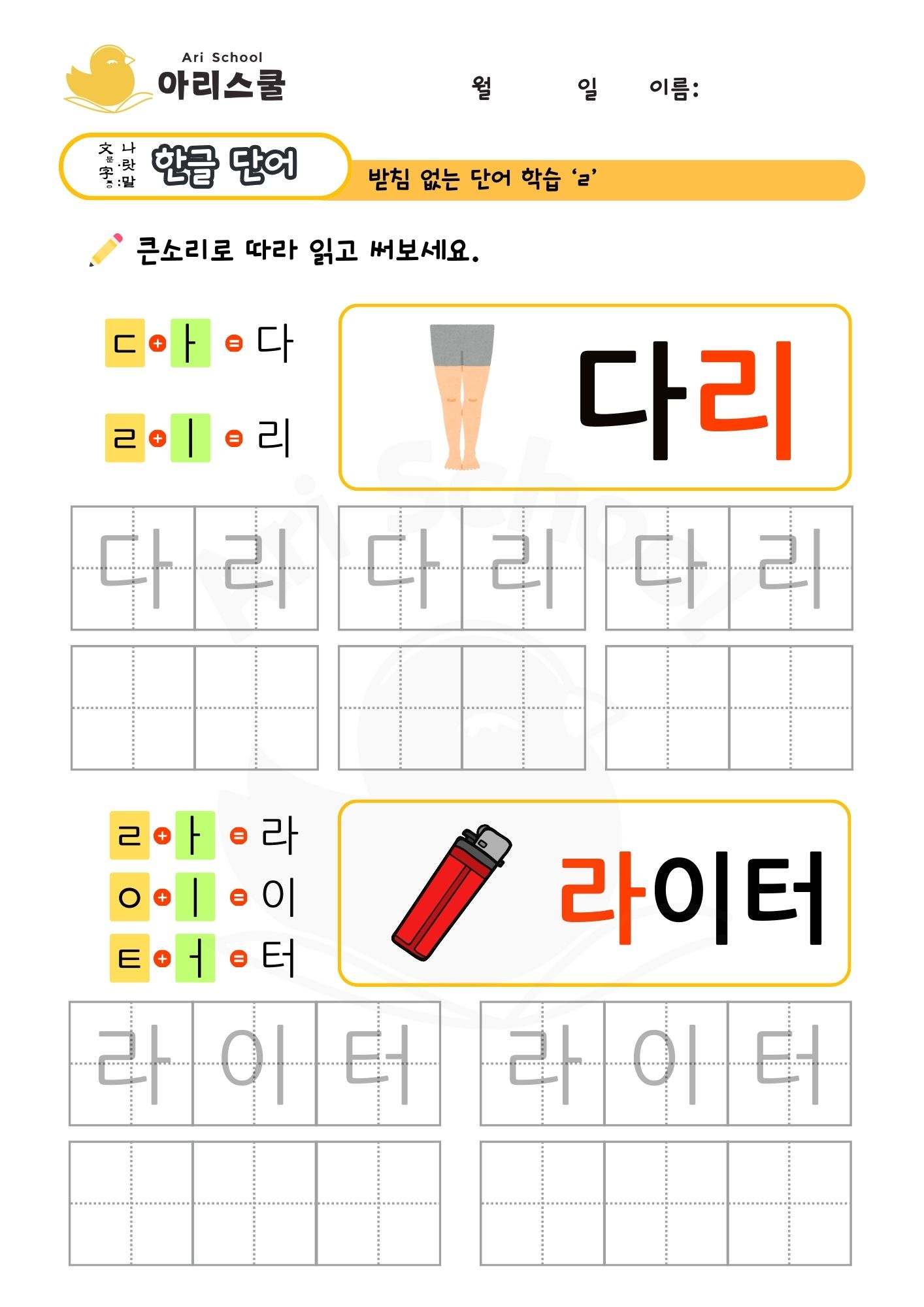 받침이 없는 단어를 연습하는 학습지입니다. 자음과 모음의 조합을 보며 어떤 소리가 나는지 읽고, 순서대로 정확하게 쓸 수 있도록 지도해주세요.