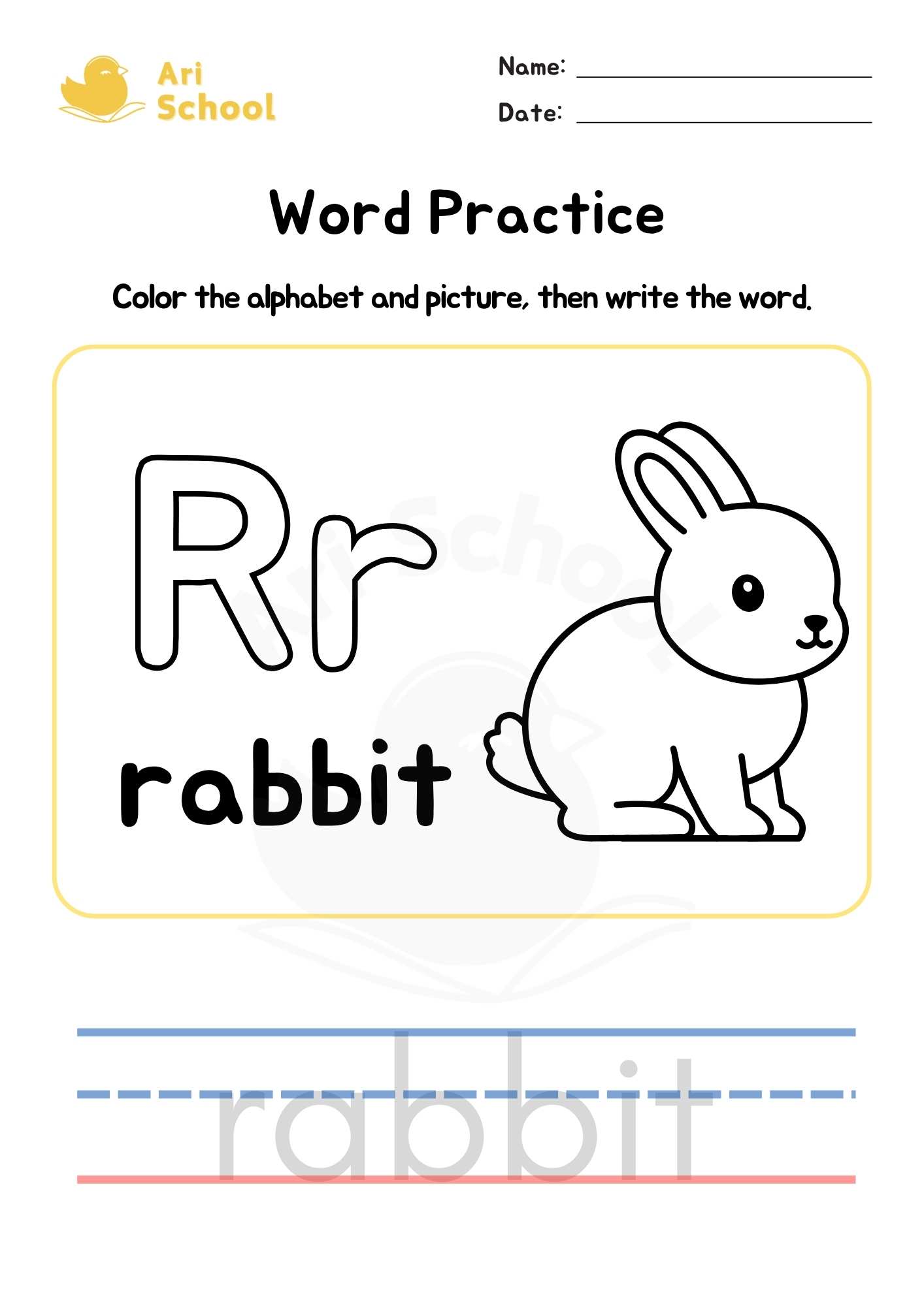 Color the alphabet and picture, then trace the word below.