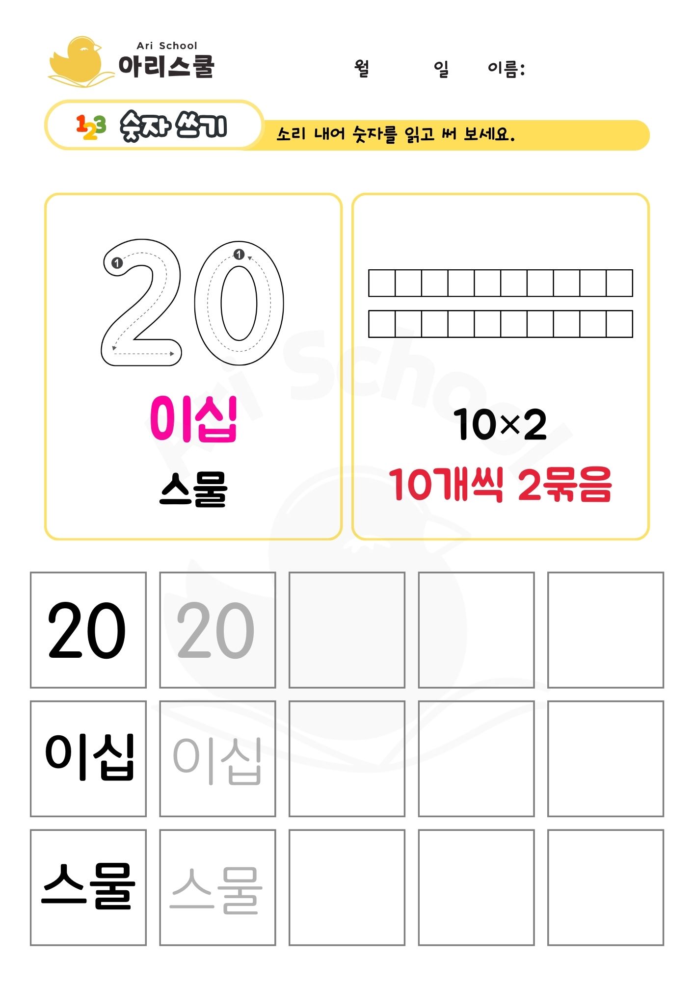 두 자리 숫자를 쓰고 읽는 방법을 함께 배우는 학습지입니다. 숫자를 올바르게 따라 쓰고, 두 가지 읽는 방법을 자연스럽게 익힐 수 있습니다. 아이들이 숫자를 정확하게 쓰고 읽을 수 있도록 지도해 주세요.