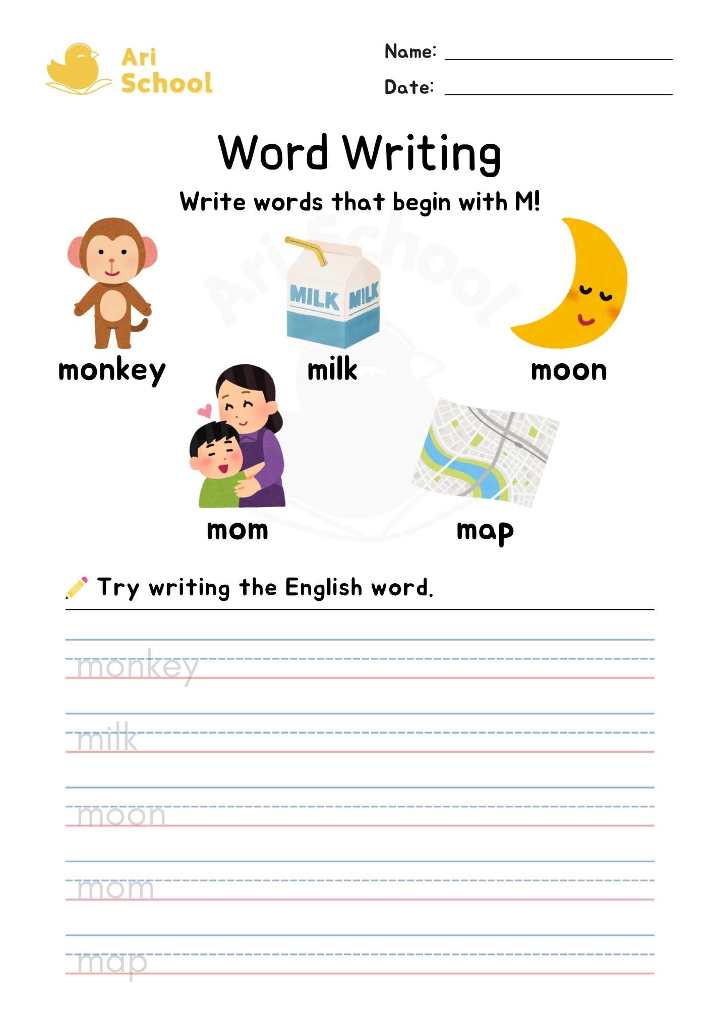 This worksheet helps children learn words that begin with the letter M.